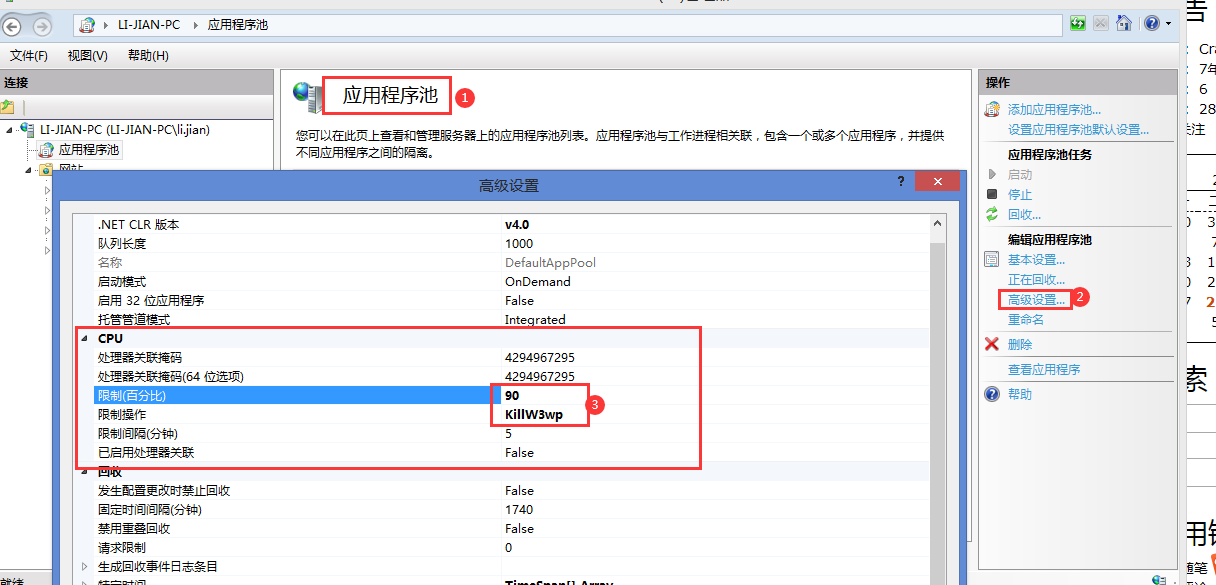 cpu如果是由于IIS占比过高的,可将该网站的应用程序池-高级设置-超过90%cpu就自动重启。