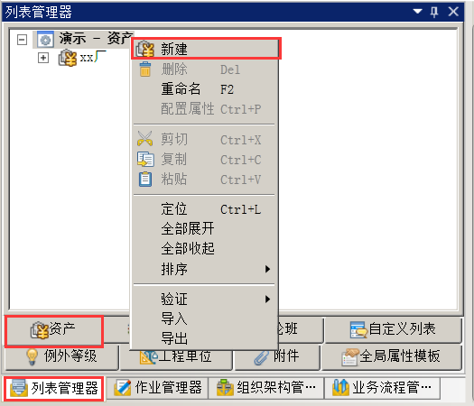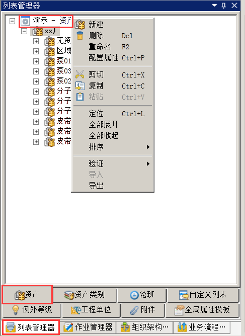 在导航栏→列表管理器→资产内右键演示-资产,在快捷菜单中即可完成资产的新建、删除、重命名、配置属性、剪切、复制、粘贴、全部展开、全部收起、排序、验证、导入和导出操作。