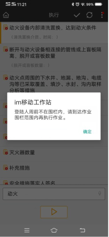 - 终端执行时,规定人员不在围栏范围会提示请到达作业围栏范围内再执行作业。。