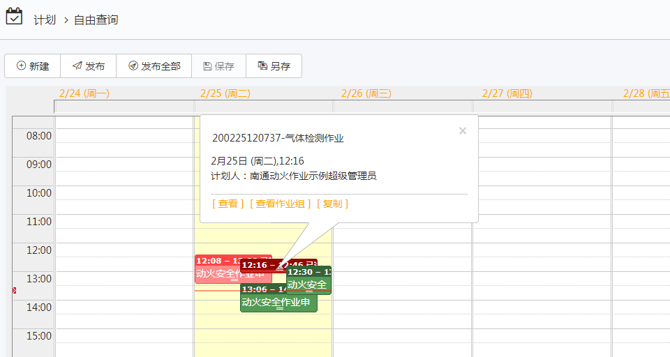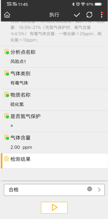 对于需要气体检测的作业,第一次检查不是完全安全范围的,每半小时创建一个检测作业组,中途暂停作业超过1h的,也会创建检测作业组,要求人员去现场检测。