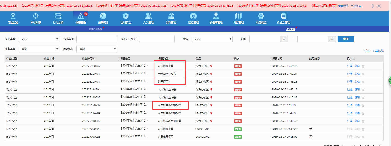 其中人员机具不合格报警是由多组报警决定的。