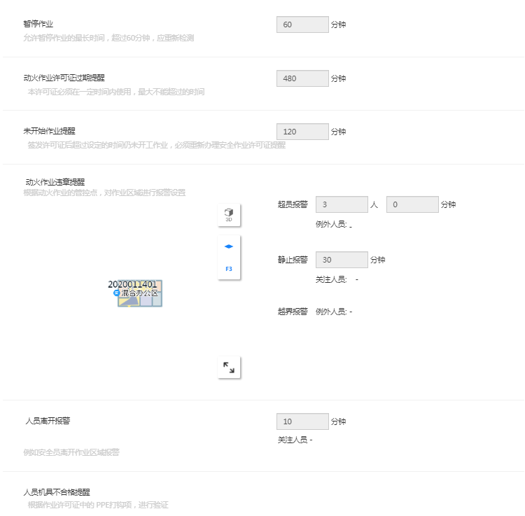 - 默认值为3人0分钟,代表围栏范围只要超过3人,钛准系统会报警。