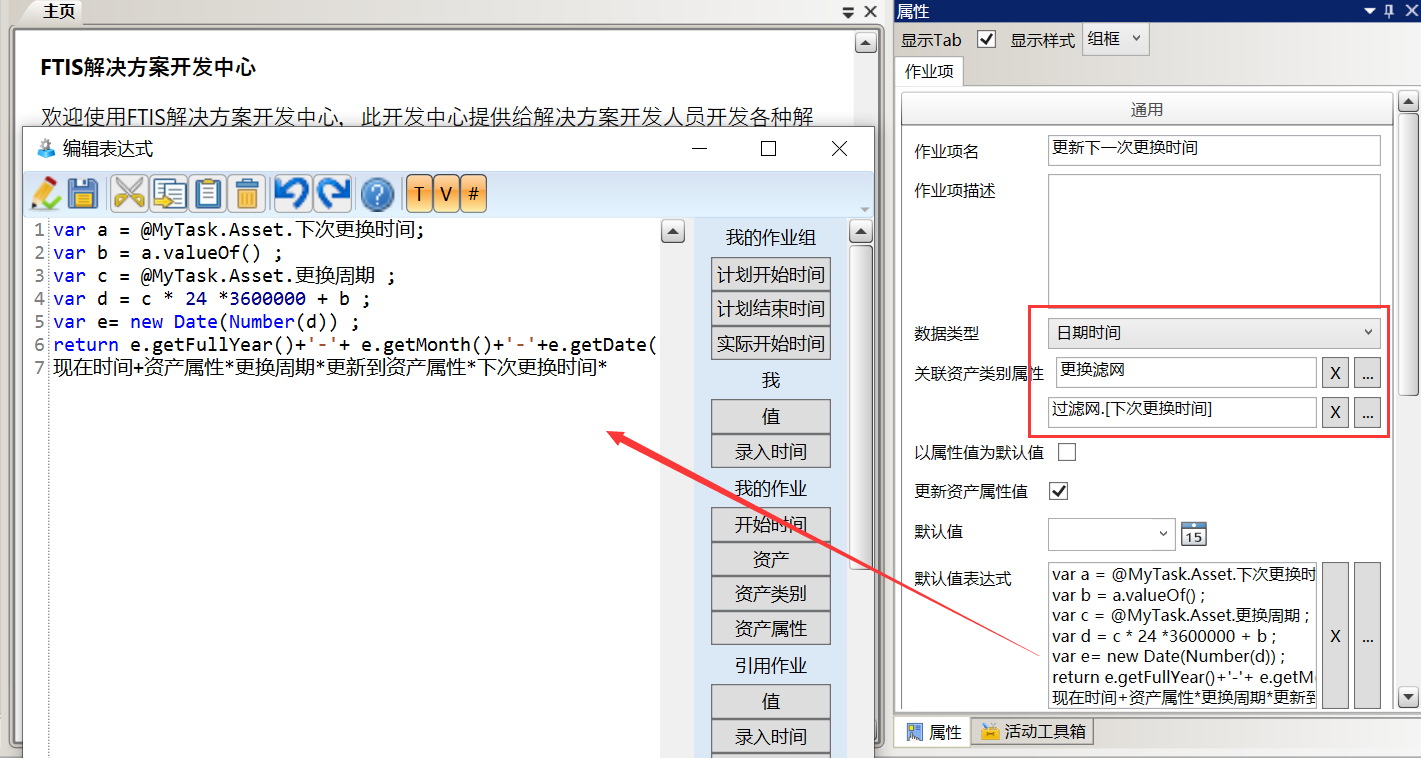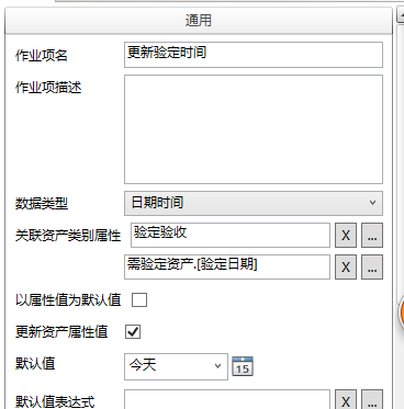 作业项数据类型为时间类型,主要作用是将当前时间更新到当前资产的资产属性验定日期。