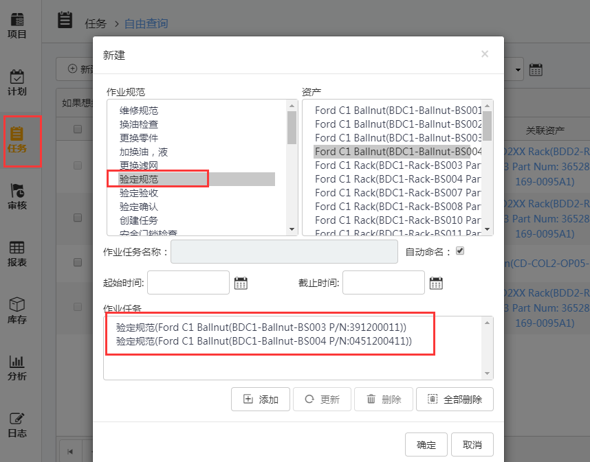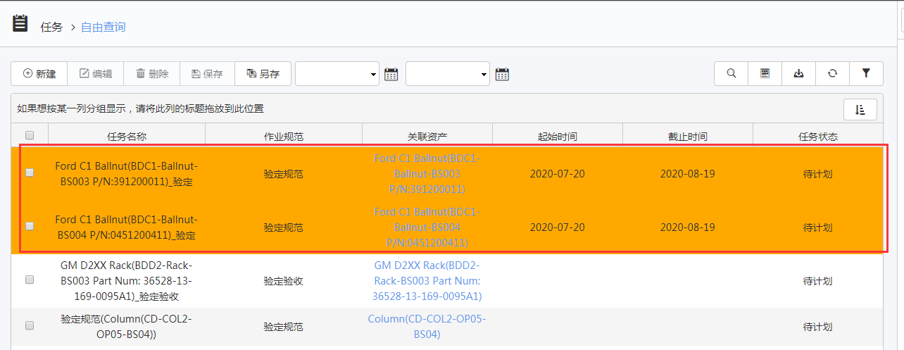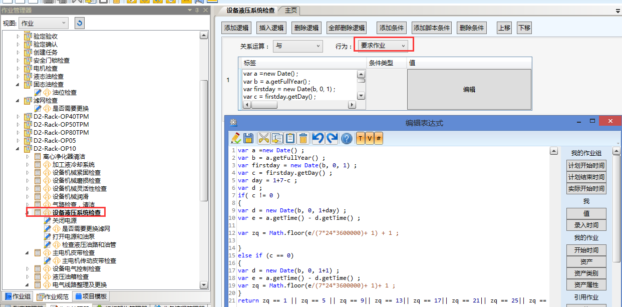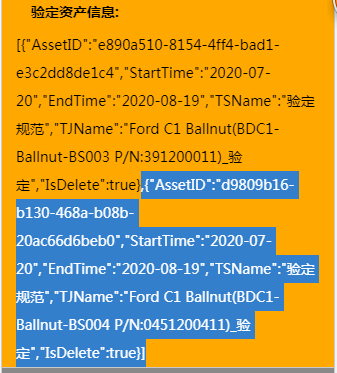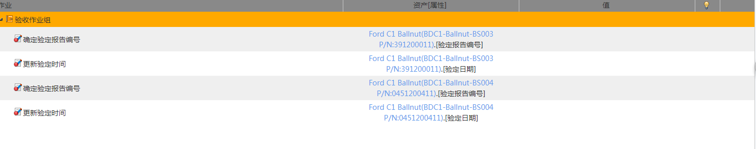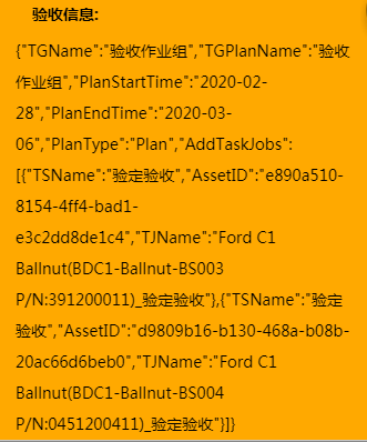 var a = @MyTask.Asset.验定日期 ;return '上次验定时间为:' + a.getFullYear()+'-'+(a.getMonth()+1)+'-'+a.getDate() + ';存放地点为:' + @MyTask.Asset.存放地点 + ';工位号为:' + @MyTask.Asset.工位号 + ';接受标准为:' + @MyTask.Asset.接受标准 +';公司编号为:' + @MyTask.Asset.公司编号 + '。' ;提示执行人上次验定的日期。var tgName = '验收作业组';var tgPropertyName = '验收作业组';var assetID = @MyTask.Asset;var assetName = @MyTask.Asset.DisplayName;var tsName = '验定验收';var paraObj = {};var tgValue = ScriptEngine.Context.GetTaskGroupPropertyValue('验收信息');if (tgValue) {paraObj = JSON2.parse(tgValue)}paraObj['TGName'] = tgName;paraObj['TGPlanName'] = tgName;var now = new Date();var startTime = now.getTime() + 168*3600000;var endTime = now.getTime() + 336*3600000 ;paraObj['PlanStartTime'] = Common.FormatDateTimeByFormat('yyyy-MM-dd', newDate(startTime)) ;paraObj['PlanEndTime'] = Common.FormatDateTimeByFormat('yyyy-MM-dd', newDate(endTime)) ;paraObj['PlanType'] = 'Plan';var addTaskJobs = [];if(paraObj['AddTaskJobs']) {addTaskJobs = paraObj['AddTaskJobs'];}var tjName = assetName + '_' + tsName;var find = _.find(addTaskJobs, function (_obj) {return _obj['TJName'] == tjName});if(!find){var obj = {'TSName':tsName,'AssetID': assetID,'TJName':tjName};addTaskJobs.push(obj);}paraObj['AddTaskJobs'] = addTaskJobs;var newTgValue = JSON2.stringify(paraObj);ScriptEngine.Context.SetTaskGroupPropertyValue('验收信息',newTgValue);return true;我们刚才的示例中是两个资产的验定,所以上述脚本执行两次之后结果如下: