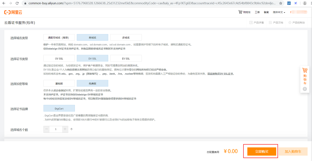 • 通过阿里云,可以申请到免费的SSL证书。首先要登录到阿里的SSL管理平台,购买免费的云盾证书服务:云盾牌服务购买地址。注意需要注册并通过实名认证的阿里云账号。然后选择如图: