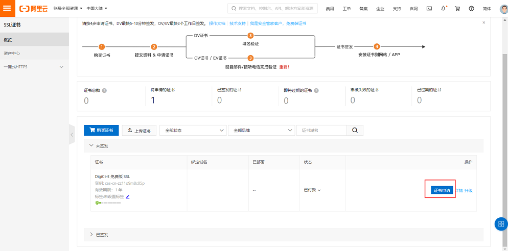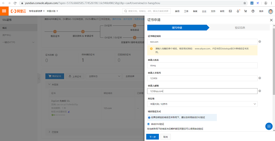 • 购买完后,在支付成功页面点击证书控制台进入SSL证书管理控制台,可以看到已购买的证书,点击证书申请,填写相关信息,点击下一步会进入到验证信息页面。
