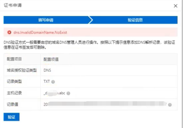 • 然后去自己的域名解析平台如阿里云腾讯云DNS.COM 等等,在域名解析列表中添加一个记录,将主机记录、记录类型、记录值填写到里面,来证明确实有对当前域名的拥有权,点击保存。在验证信息页面,点击验证,一旦验证通过,那么就可以点击下面的提交审核按钮了。