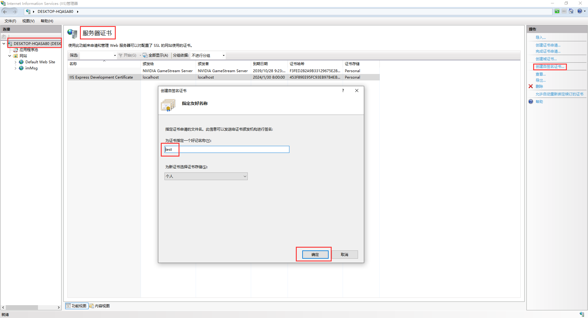 • 点击iis根目录,找到服务器证书,双击进入后,在右侧操作中选中创建自签名证书,填写信息,确定,就创建了一个服务器证书。