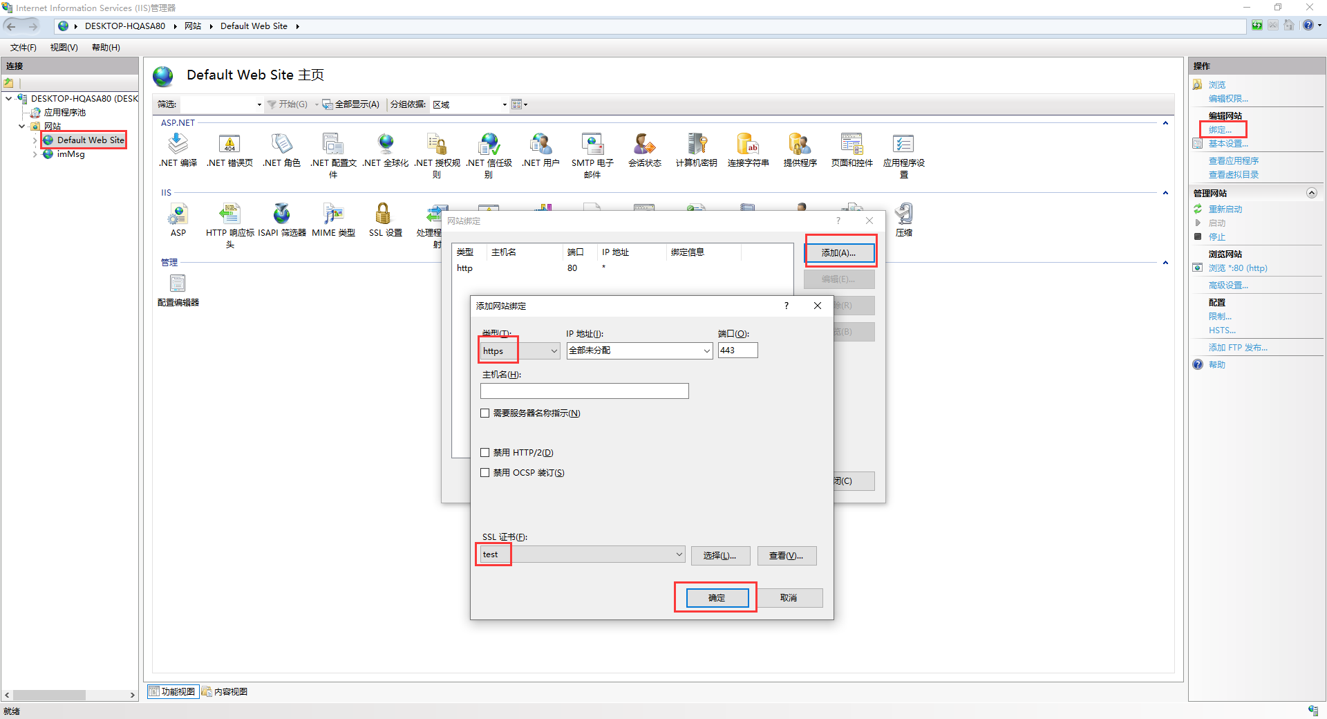 • 创建完后,选择网站,点击绑定,选择添加,类型选择https,ssl证书选择创建的自签名证书,点击确定即可。